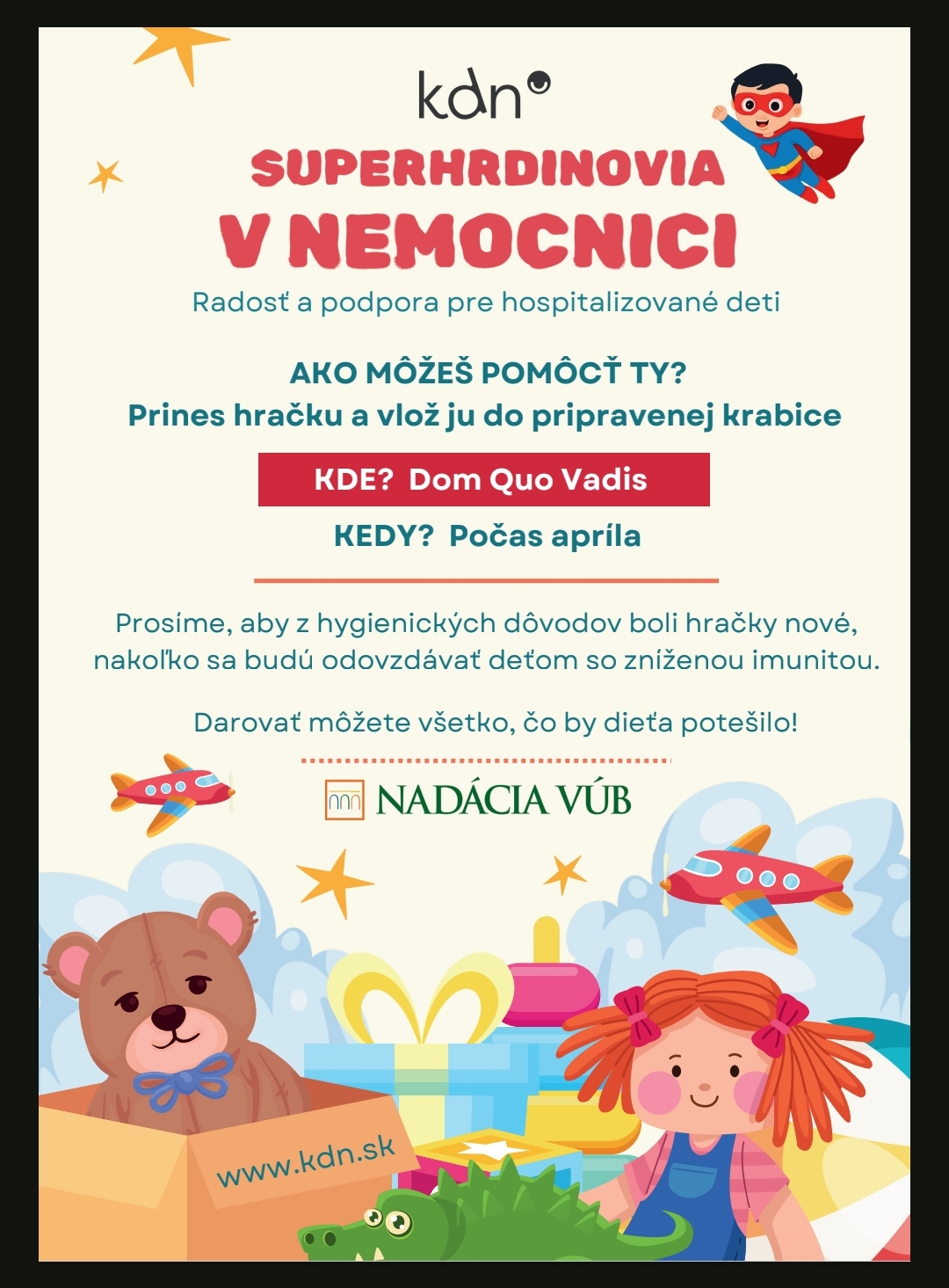 Pridajte sa aj Vy k zbierke hračiek pre deti v nemocniciach. Klub detskej nádeje v mesiaci apríl v Dome Quo Vadis zbiera hračky. Hračky musia byť nové, lebo idú pre deti so zníženou imunitou.
